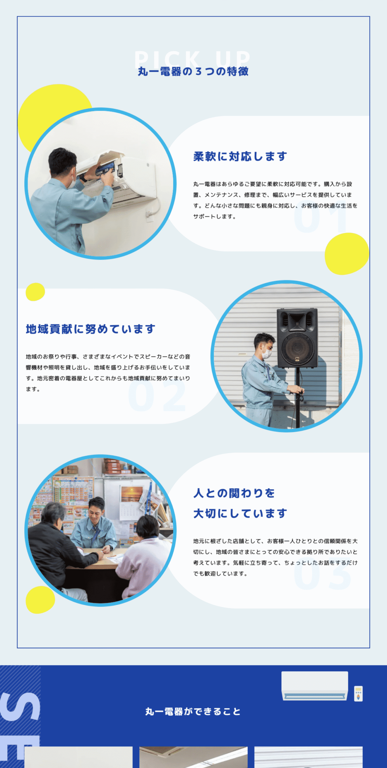 今回のウェブサイト制作では、「人とのつながりを大切にする姿勢」と「相談しやすさ」が訪問者に自然と伝わるようなトーン設計を大切にし、丸一電器様の魅力を、温かみのあるデザインと親しみやすい言葉選びを意識してサイトを構築しました。初めての方でも不安なく連絡できるよう、電話番号の表示位置や視認性に配慮し、シンプルなナビゲーションでサービス内容へスムーズにたどり着ける導線設計を取り入れました。