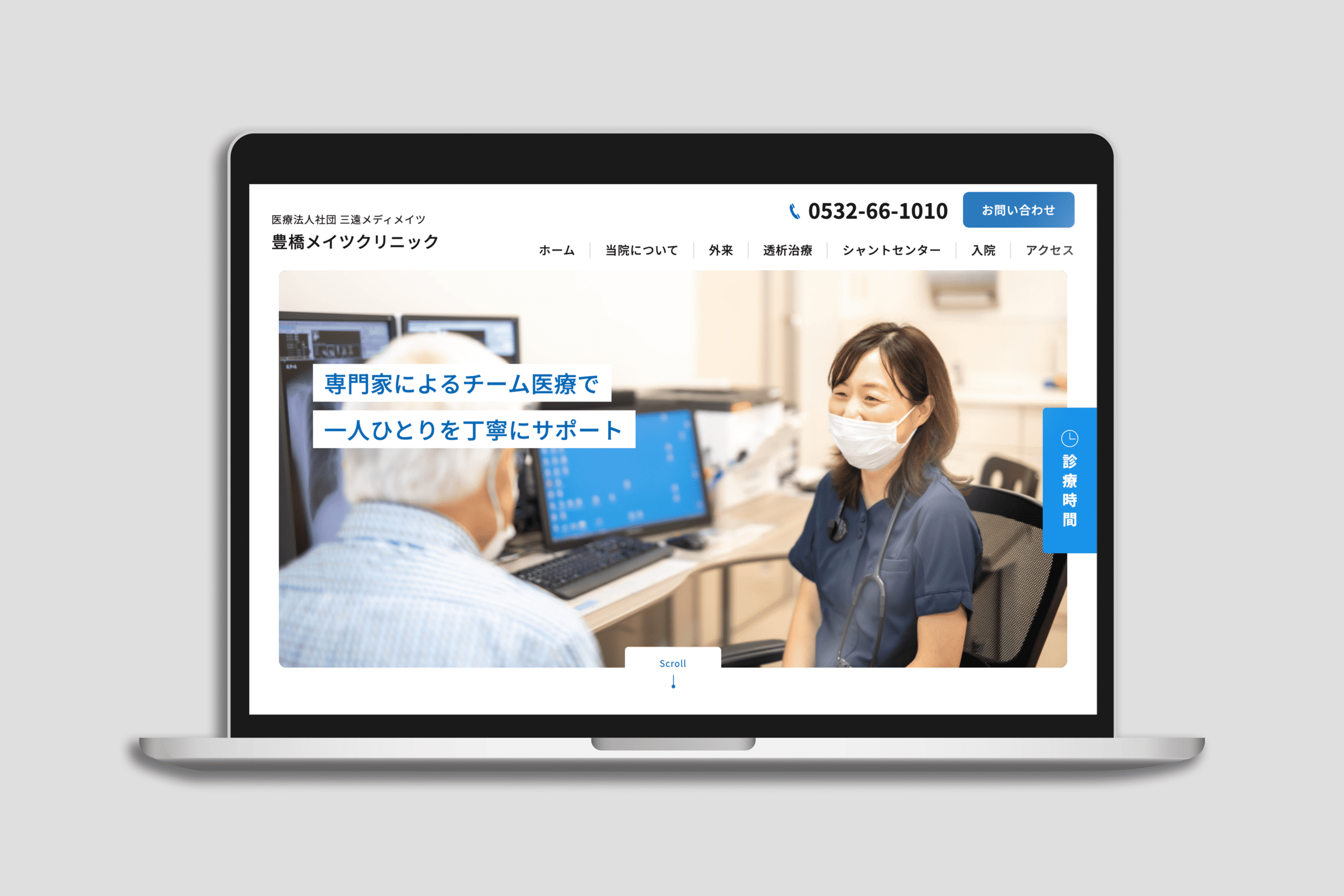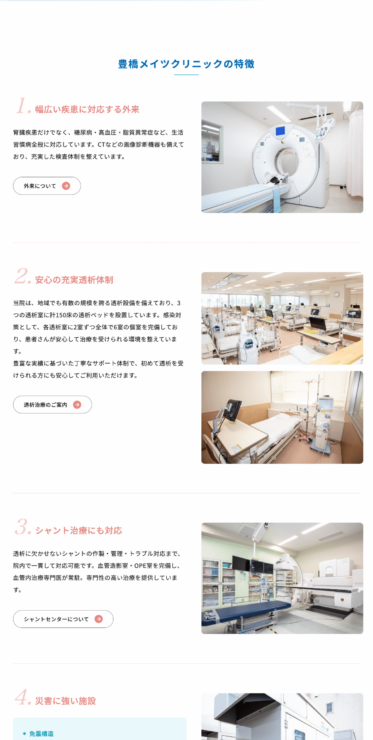 透析治療や腎臓・生活習慣病など専門性の高い医療内容を、患者様やご家族が安心して理解できるように導くことを最優先に設計しました。透析・外来・シャント治療といった専門的な医療は、専門用語や情報が多くなりがちですが、サイトではわかりやすさを重視した構造と表現を意識しています。 専門的な用語は可能な限り“やさしい言葉”で説明し、血液透析と腹膜透析の違いは比較表などを用いて、治療の選択肢や違いが視覚的に理解できる構成としています。 また、通院方法(例:市電「井原電停」「運動公園前」下車 徒歩5分)や、外来・透析・シャントセンターの対応時間も一覧で整理し、患者様の日常生活に即した情報提供を重視しています。